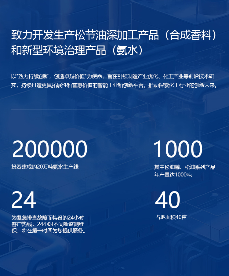 上品公司是一家致力开发生产松节油深加工产品(合成香料)和新型环境治理产品(氨水)的精细化工企业。公司依托区内丰富的松脂资源,利用松节油为原料开发和生产20多种合成香料产品,主要产品有: 松油醇(Terpineol);松油(Pine Oil);对伞花烃(Para Cymene);异长叶烯(Isolongifolene);长叶烯(Longifolene);双戊烯(Dipentene);异松油烯(Terpineolene);柠檬烯(Limonene);α-松油醇(α- Terpineol);诺甫醇(Nopol);乙酸诺甫酯(Nopyl Acetate);莰烯(Camphene);醋酸异龙脑酯(Isobornyl Acetate)。其中松油醇、松油系列产品年产量达1000吨,大部分产品出口创汇。 |